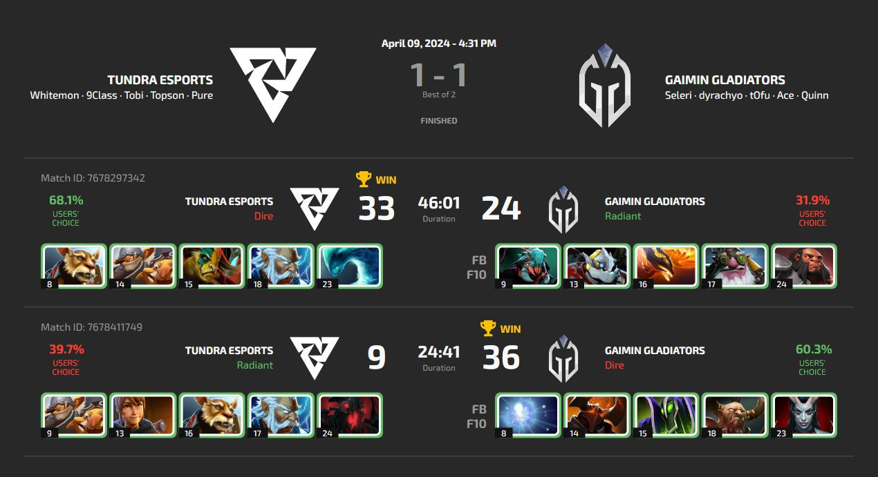 Another interesting matchup was the confrontation between the Gaimin Gladiators and Tundra Esports. In the first map, the Gladiators maintained a decent lead, peaking at 11,000. However, dyrachyo’s Weaver was picked off trying to cut waves, allowing Tundra to subsequently take a good fight and turn the game around. Pure's Morphling made a comeback into the game and got the job done to win the first map.
