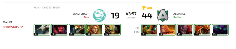 Начало матча получилось обескураживающим для коллектива из Южной Америки. Уже к 7 минуте их отставание приближалось к 5 тысячам и продолжало расти. Несмотря на слабый старт, beastcoast удалось затянуть матч до 43 минуты. В определенный момент они даже могли выиграть, но Alliance оказались сильнее. После поражения beastcoast на турнире не осталось южноамериканских команд.