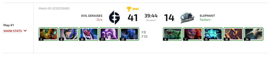 Самый интересный матч дня оставался напоследок. Противостояние двух грандов в нижней сетке — Evil Geniuses и Elephant. Перед началом матча мнение пользователей разделились на 65% за Evil Geniuses и 35% за Elephant.