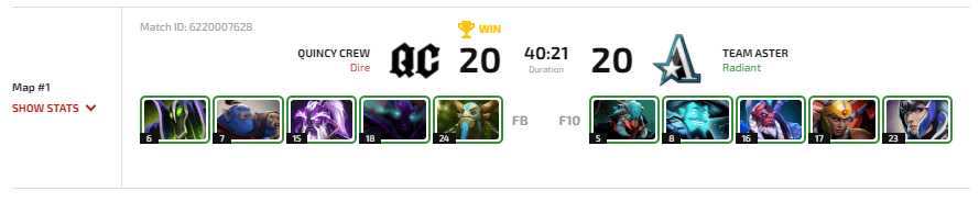 Вторым матчем на вылет было противостояние многострадальных Team Aster и Quincy Crew. Ситуация по предсказаниям была практически такой же, как и в предыдущем матче: 60% на 40% в пользу Team Aster.