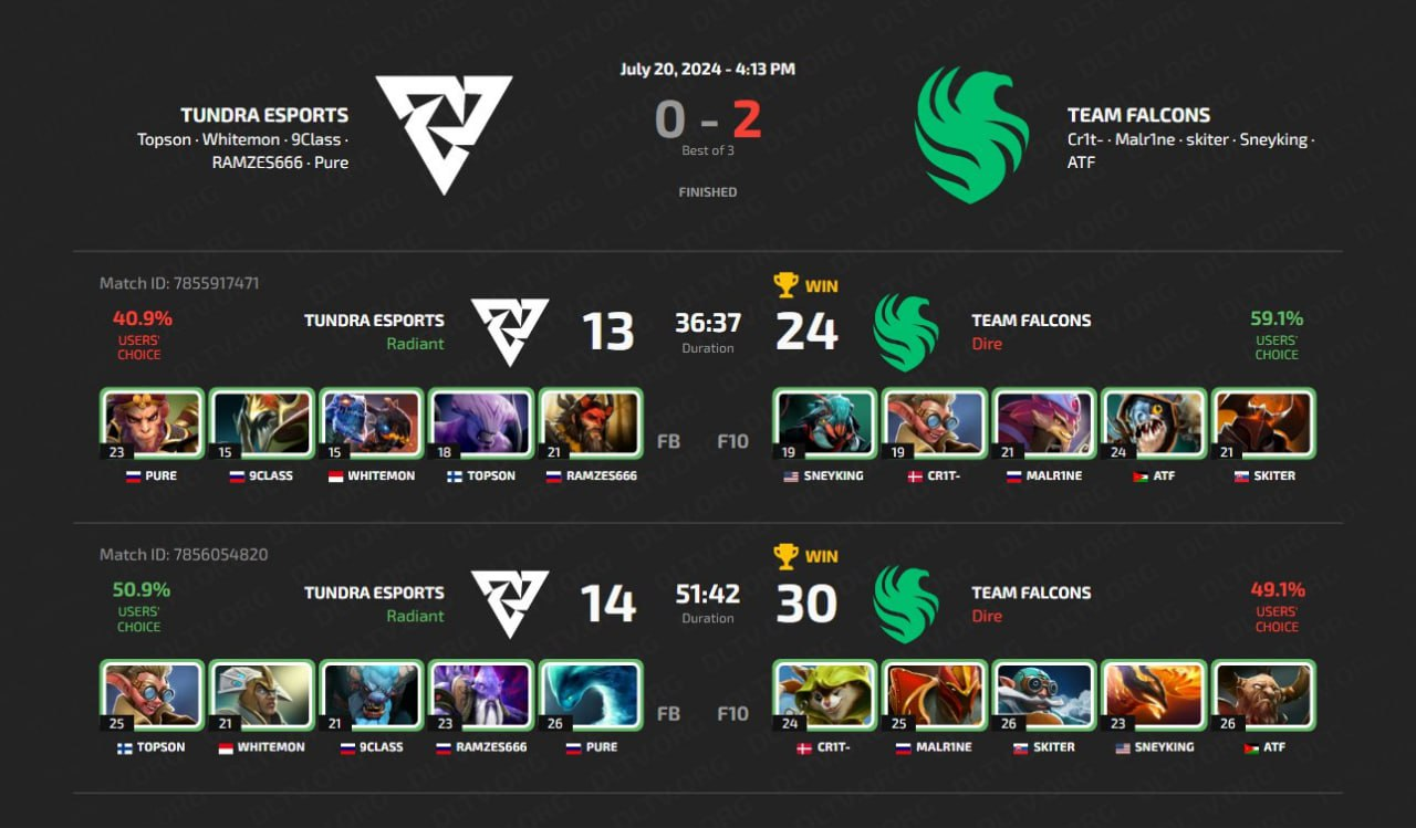 Первая карта прошла при полной доминации Team Falcons. ATF показал себя на сигнатурном Slark, а для skiter взяли Chaos Knight. Драфт Team Falcons оказался слишком сильным и уже на 36 минуте у Tundra Esports упал Трон. На второй карте Team Falcons выиграли линии и набрали небольшое преимущество, что позволило рано убить первого Рошана, однако Tundra Esports приняла отличную драку на своем вижене. RAMZES666 на Dark Seer поставил хорошую "стенку", а Pure на Morphling нанес достаточное количество урона. Tundra Esports отыграли отставание, но набрать преимущество не получилось. На 38 минуте Tundra Esports словили удачный тайминг и забрали Аегис, но Pure ошибся, задайвив на вражеский хайграунд. Cr1t- нанес огромное количество урона, Team Falcons убили трех героев и вновь захватили преимущество. После этого момента, Tundra Esports посыпались и за следующие 10 минут смогли сделать всего один фраг. На 50 минуте Pure вновь ошибся и умер, не оставив денег на выкуп, за счет чего Team Falcons смогли слегкостью сломать Трон.