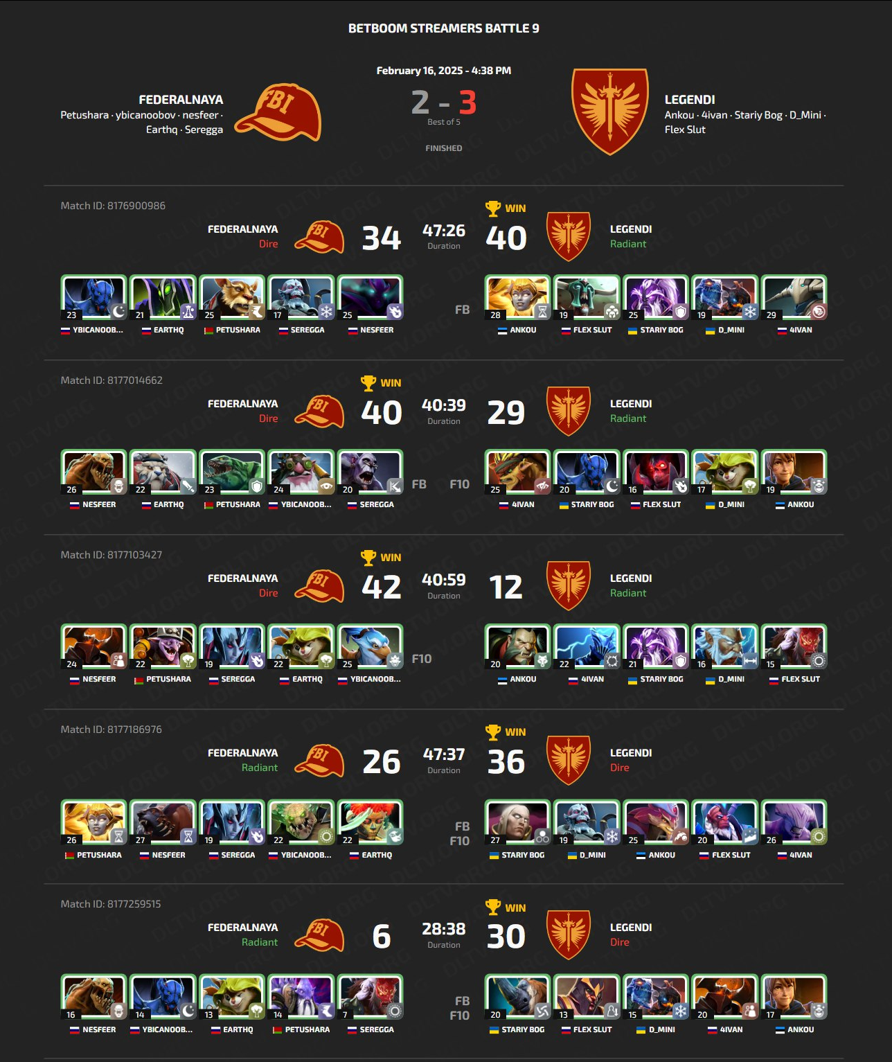 LEGENDI стали чемпионами BetBoom Streamers Battle 9, обыграв FEDERALNAYA. Во время гранд-финала LEGENDI камбекнули четвертую карту, когда счёт в серии был 2-1. За первое место команда получила 2,500,000 рублей.