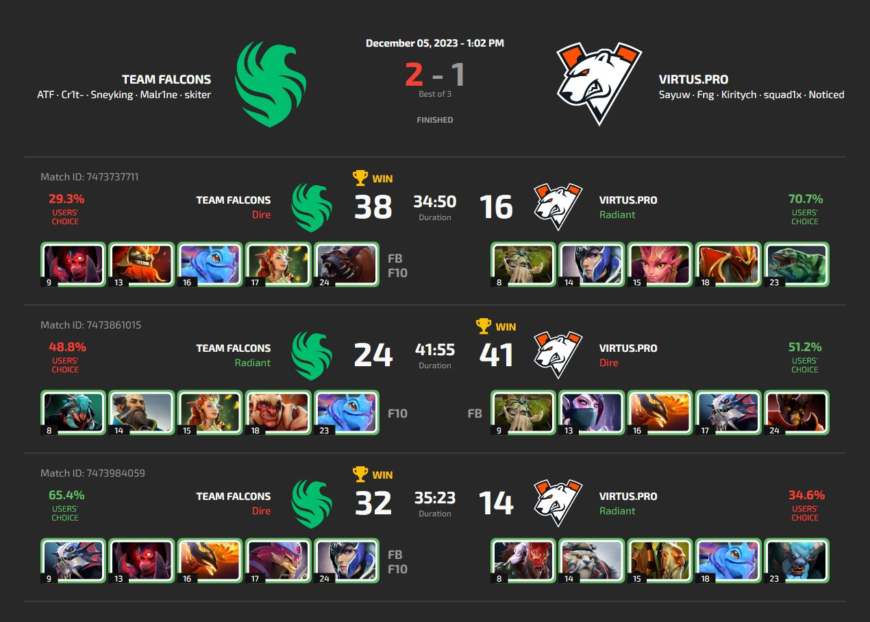 In the Lower Bracket, Falcons took care of Virtus.Pro, one of the strongest competitors in the tournament with a score of 2-1. The MENA squad easily won the first game, and the second game looked excellent in the laning stage. However, Virtus.Pro could steal the second map from the Falcons, but it didn’t matter, as Falcons could quickly close the series by winning Game 3.