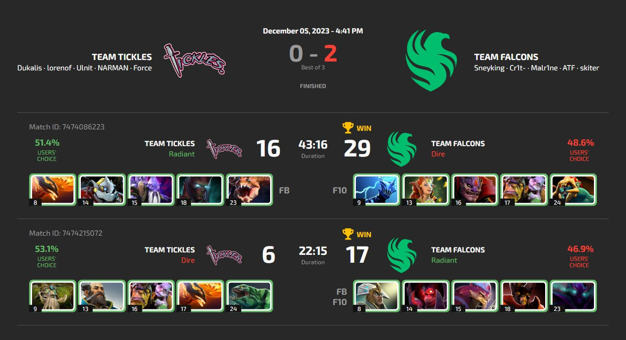 The victory against Virtus.Pro put Falcons in the Lower Bracket Final, where they faced Team Tickles. In the first game, Falcons demolished the ex-Geek Fam stack to be up 1-0. Unfortunately, in the second game, Team Tickles Offlaner Force had issues with his game. He tried restarting Dota three times, but simply could not reconnect to the game. After a long pause, the game was forced to resume with Team Tickles playing 4 vs 5. Due to this, Team Tickles called GG at the 22-minute mark, giving Falcons the series win.