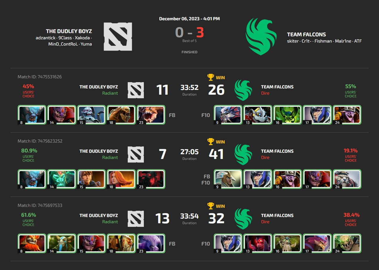In the Upper Bracket, Team Falcons's run was abruptly stopped after losing to The Dudley Boyz in an unexpected upset. However, Falcons could tidy up their gameplay to breeze through the Lower Bracket and set up a rematch against MinD_ContRoL’s team.