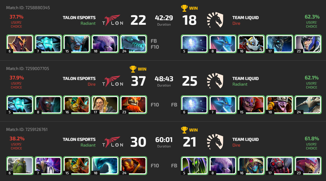 Невероятной получилась третья карта. Обе команды взяли медленные драфты и стремились в лейт. Team Liquid на протяжении всей игры вели по общей ценности, но главной проблемой, в очередной раз, стал 23savage на Morphling, занимавший первую строчку по нетворсу. После 48 минуты, Talon Esports начали выигрывать каждую драку, а Zai на Broodmother успешно сплит-пушил линии. В решающей драке Mickey и Nisha умерли после байбеков. Zai “Просмотрел 14000605 вариантов будущего, из которых победным был только один…”. Увидев, что крипы ломают вражеские T4 вышки, он купил Boots of Travels и начал пушить. Boxi на Rubik сбил телепорт 23savage украденным Avalanche, а iNSaNiA не дал вернуться на базу Mikoto. “Жидкие” использовали укрепление строений и Zai без сопротивления сломал Трон.