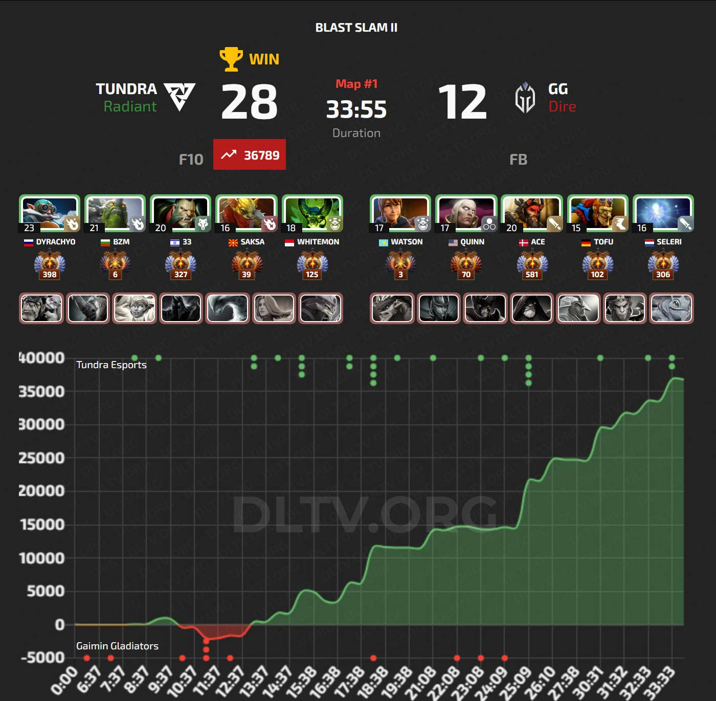 На первой карте Gaimin Gladiators решили попробовать комбинацию героев Marci Io, которая не сработала, Gaimin Gladiators с треском проиграли все линии, когда их драфт был сделан с акцентом на быстрый сноуболл — Tundra Esports с легкостью выиграли первую карту.