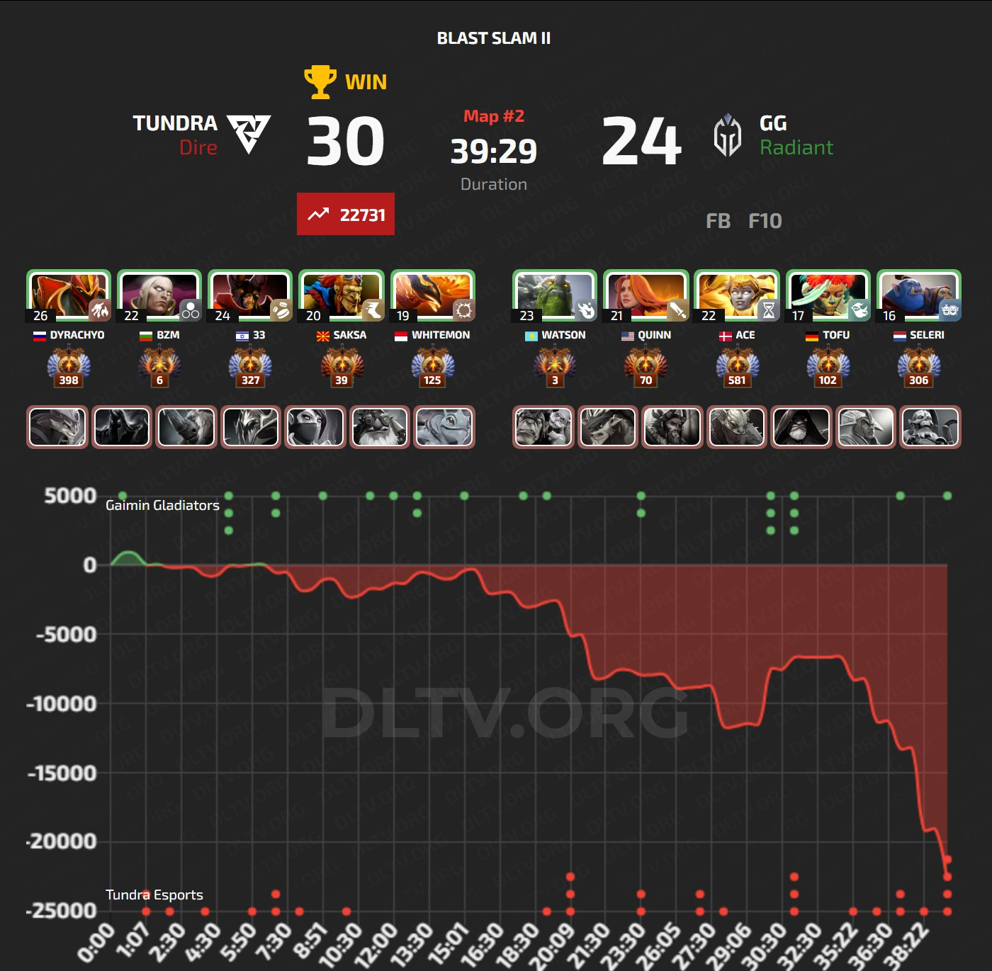 Вторая карта началась позитивно для Gaimin Gladiators, коллектив смог сделать первое убийство, когда Whitemon пытался забрать руну золота, но по итогу линии все равно закончились в пользу Tundra Esports. Далее Tundra Esports всю игру имели огромный перевес по золоту, благодаря 33 на Doom. Tundra Esports забрали Рошана и спокойно закончили вторую карту.