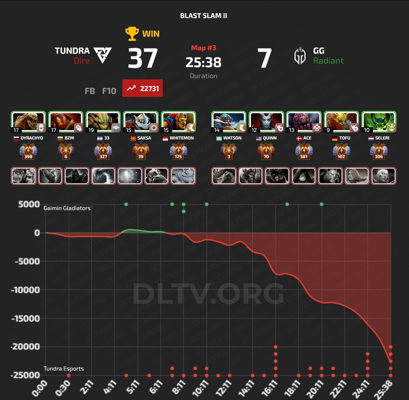 На третью карту Gaimin Gladiators взяли своих сигнатурных героев: Broodmother для Ace и Queen of Pain для Quinn, но даже эти герои не смогли помочь Gaimin Gladiators выиграть карту — Tundra Esports вновь выиграли линии и коллектив закончил финальную карту на 25 минуте. На третьей карте Gaimin Gladiators сделали всего семь убийств.