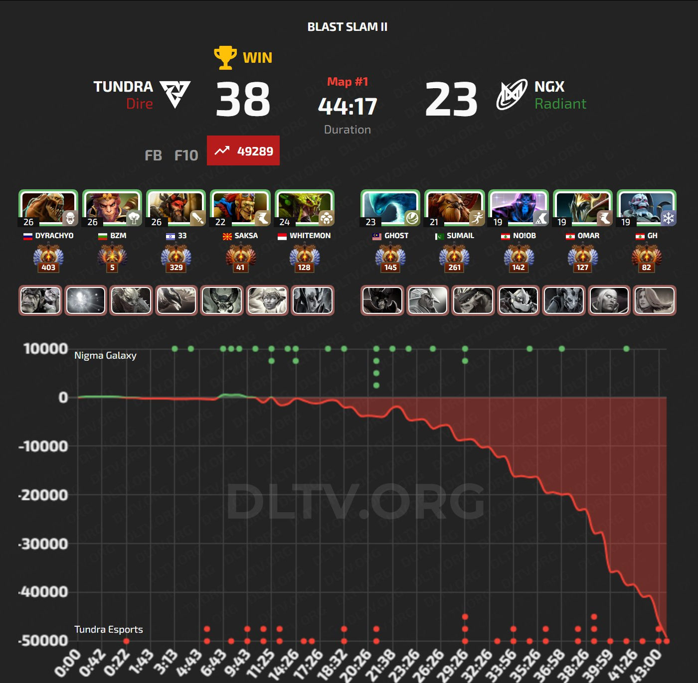 Nigma Galaxy имели шансы выиграть и первую карту. Первые 20 минут у Tundra Esports не было сильного преимущества, благодаря Ghost, который имел самый высокий нетворс до 38 минуты, но это не помогло Nigma Galaxy выиграть, плохая макро игра от Nigma Galaxy стоила им карты.